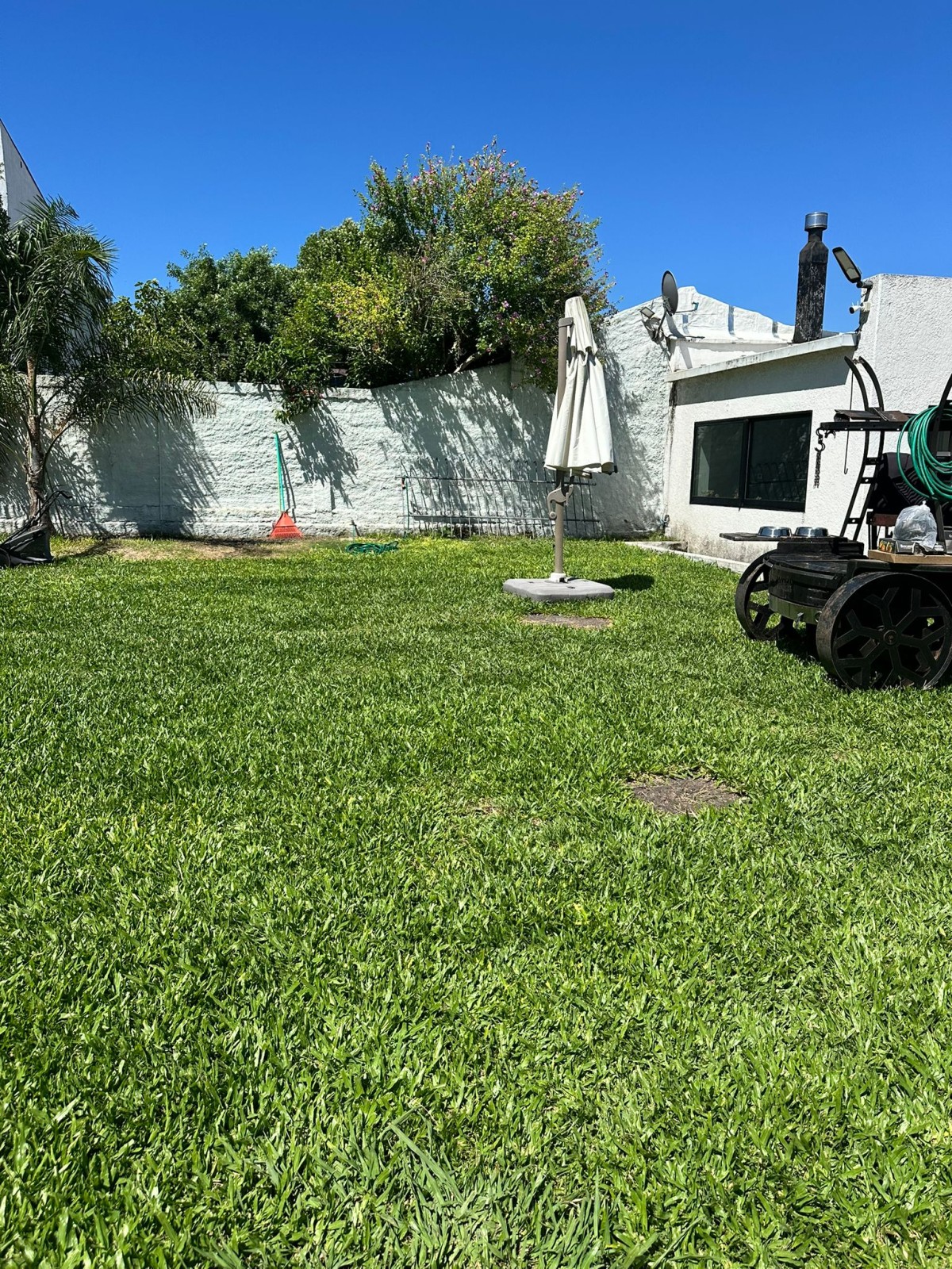 Gran patio con césped.