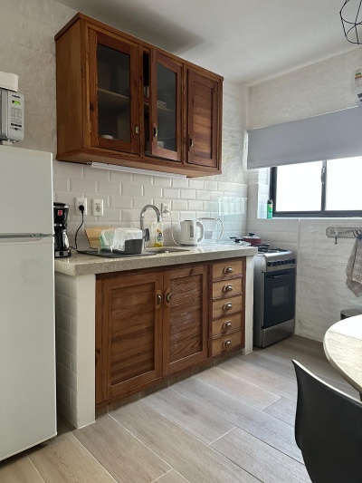 Dispone de un living comedor luminoso con cocina integrada, completamente reciclada, con un diseño moderno y práctico.