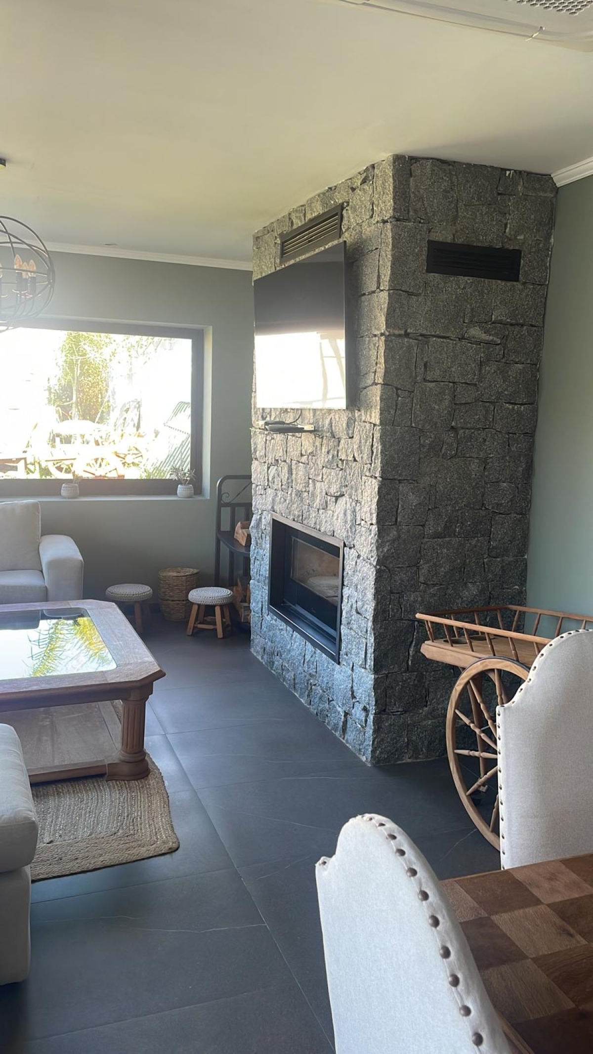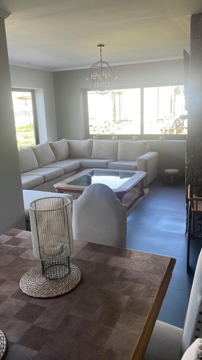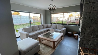 Living amplio y muy luminoso con estufa a leña empotrada (de alto rendimiento).